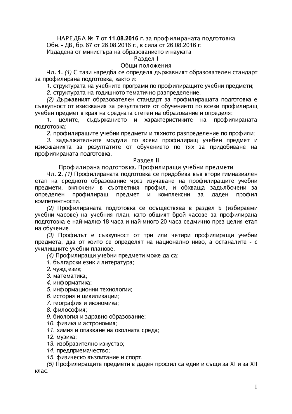 НАРЕДБА № 7 от 11 август 2016 г за профилираната подготовка